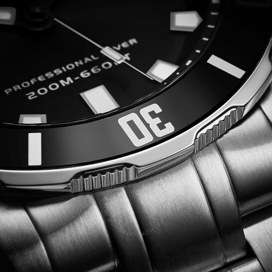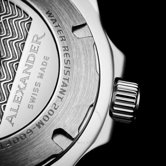 Silver-tone stainless steel case and bracelet. Uni-directional rotating black stainless steel bezel. Black dial with black hands and Arabic numeral hour markers. Minute markers around the outer rim. Dial Type: Analog. Luminescent hands and markers. Date display at the 3 o'clock position. Ronda Caliber 715 quartz movement. Scratch resistant sapphire crystal. Screw down crown. Solid case back. Round case shape, case size: 42 mm, case thickness: 11 mm. Band width: 22 mm, band length: 8 inches. Deployment with push button release clasp. Water resistant at 200 meters / 660 feet. Functions: date, hour, minute, second, battery eol indicator. Alexander 2 Series. Dive watch style. Watch label: Swiss Made. Alexander Alexander 2 Quartz Black Dial Men's Watch A501B-01.