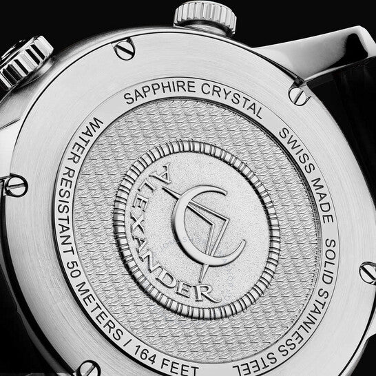 Silver-tone stainless steel case and bracelet. Fixed silver-tone stainless steel bezel. Green dial with silver-tone hands and Roman numeral & index hour markers. Minute markers around the outer rim. Dial Type: Analog. Luminescent hands and markers. Date display at the 3 o'clock position. Ronda Caliber 515.24H quartz movement. Scratch resistant sapphire crystal. Pull / push crown. Solid case back. Round case shape, case size: 42 mm, case thickness: 9 mm. Band width: 22 mm, band length: 8 inches. Deployment with push button release clasp. Water resistant at 50 meters / 165 feet. Functions: date, GMT, second time zone, hour, minute, second. Alexander 2 Series. Dress watch style. Watch label: Swiss Made. Alexander Alexander 2 Quartz Green Dial Men's Watch A171B-04.