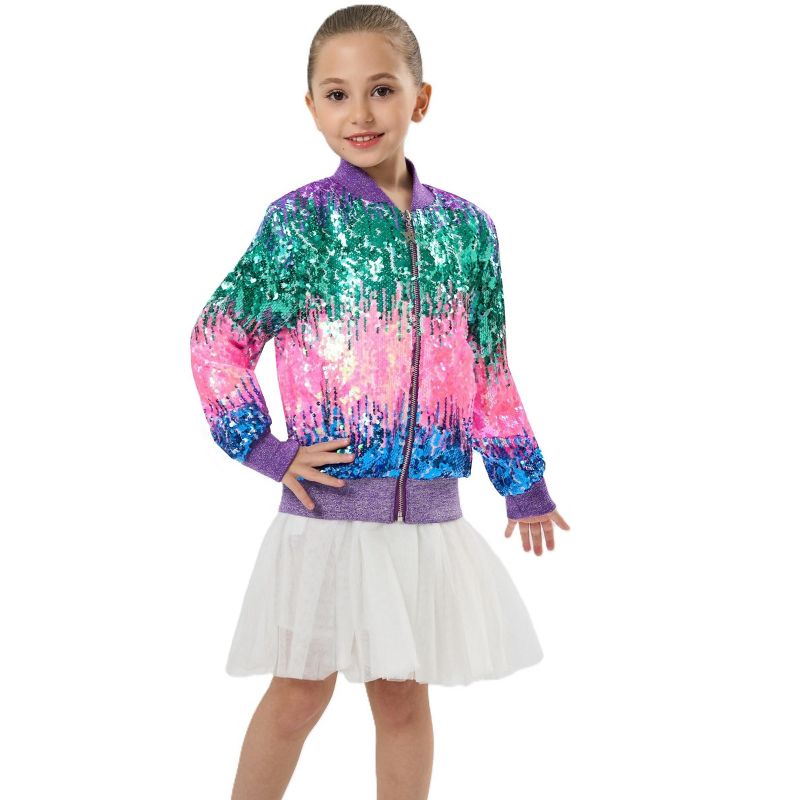 Add a burst of color and sparkle to your wardrobe with this vibrant sequin bomber jacket! Featuring a dazzling gradient design of green, pink, and purple sequins, this jacket is perfect for making a bold statement. The shimmering effect catches the light beautifully, while the glittery purple ribbed cuffs and collar add extra flair. With a convenient zip-up front and comfortable fit, this jacket is ideal for parties, special occasions, or any day you want to stand out in style. A show-stopping piece for your little fashionista!