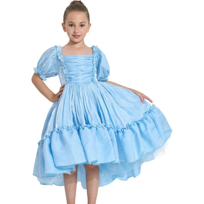 - High-low hemline, Full skirt with layered volume and a ruffled seam above the hemline, enhancing the fairy-tale silhouette.