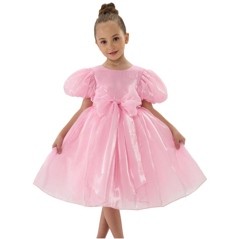 - This dreamy dress features voluminous puff sleeves, a stunning oversized bow, and layers of shimmering organza.