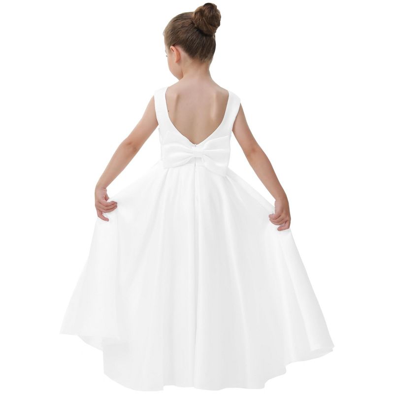 The floor-length satin skirt flows beautifully, creating a smooth and luxurious silhouette, perfect for formal occasions such as weddings, parties, or celebrations. The design combines simplicity and sophistication, making it an ideal choice for flower girl duties or other special events