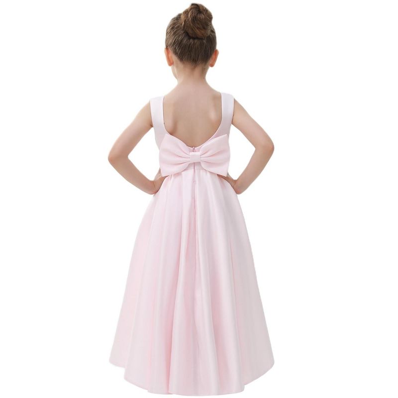 - This sleeveless satin girl’s maxi dress is in a soft, delicate pink hue. The back of the dress features a stunning heart-shaped open-back design, adding a touch of elegance.