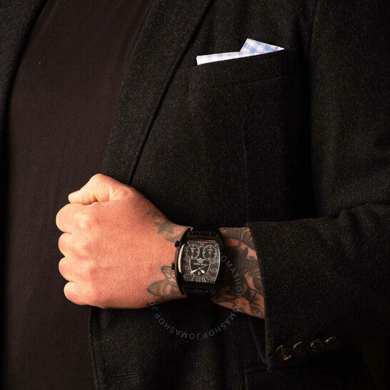 Polanti 3-TIME ZONE/CRONOGRAPH - Black-IP, Swiss Movements, Black -Rose tone date Dial,Genuine leather band, Black stainless steel case with a black genuine leather strap. Fixed black stainless steel bezel. Rose gold-tone dial with rose gold-tone hands and Arabic numeral & index hour markers. Minute markers around the outer rim. Dial Type: Analog. Luminescent hands and markers. Date display at the 4 o'clock position. Chronograph - sub-dials displaying: dual time. Ronda 8161 quartz movement. Scratch resistant mineral crystal. Screw down crown. Solid case back. Rectangle case shape, case size: 46 mm, case thickness: 11 mm. Band width: 26 mm, band length: 7.5 inches. Buckle clasp. Water resistant at 30 meters / 100 feet. Functions: chronograph, day, date, hour, minute, second. 3t-zone Series. Casual watch style. Watch label: Swiss Movement. Polanti 3T-Zone Chronograph Quartz Rose Gold Dial Men's Watch PL2400-IPBK-RG.