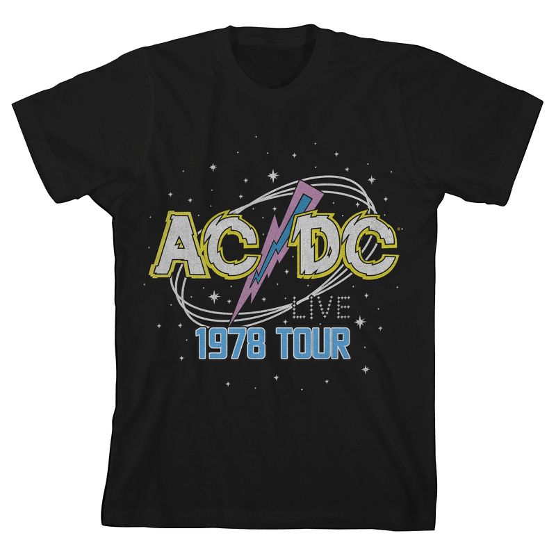 Celebrate your favorite rock music with this ACDC tee. The shirt features the band's white and yellow letters that spell out the band's logo in front of a background of stars while blue text below the logo reads, "1978 Tour." The tee comes in a black short sleeve crew neck. Fans of the rock group will love this comfy cotton t-shirt.