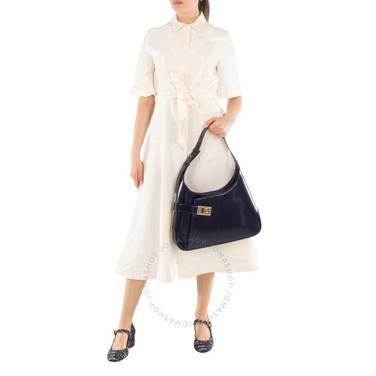 Ferragamo Ladies Shoulder Bag. SKU: 215492 767895. Color: Blue. Ferragamo Adjustable Handle Leather Bag. This bag is crafted from calf leather with a smooth grain and features an asymmetric design, tonal stitching, and a Gancini flip-lock fastening. It has silver-tone hardware, a concealed magnetic fastening, an adjustable top handle, an internal zip-fastening pocket, and a main compartment. 100% calfskin. Made in Italy.