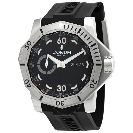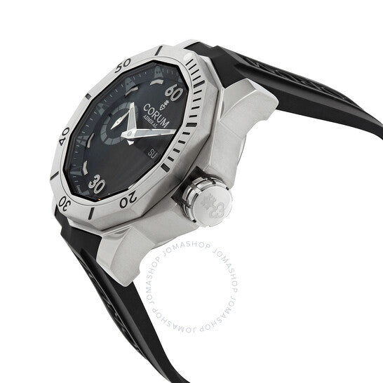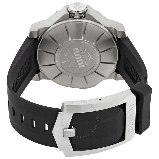 Grey titanium case with a black rubber strap. Grey titanium bezel. Black dial with silver-tone hands and index hour markers. Minute markers around the outer rim. Dial Type: Analog. Luminescent hands and markers. Day of the week and date display at the 3 o'clock position. Automatic movement. Scratch resistant sapphire crystal. Round case shape, case size: 48 mm. Water resistant at 1000 meters / 3300 feet. Functions: date, day, hour, minute, second. Admiral's Cup Deep Hull Series. Sport watch style. Watch label: Swiss Made. Corum Admirals Cup Deep Hull Automatic Black Dial Men's Watch A690/04304.