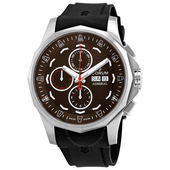 Silver-tone stainless steel case with a black rubber strap. Fixed silver-tone stainless steel bezel. Brown dial with luminous silver-tone hands and index hour markers. Minute markers around the outer rim. Dial Type: Analog. Luminescent hands and markers. Day of the week and date display at the 3 o'clock position. Chronograph - three sub-dials displaying: 60 second, 30 minute and 12 hour. Corum Calibre CO 077 Automatic movement, containing 25 Jewels, bitting at 28800 vph, and has a power reserve of approximately 42 hours. Scratch resistant sapphire crystal. Pull / push crown. Transparent case back. Dodecagon case shape, case size: 47 mm. Deployment clasp. Water resistant at 100 meters / 330 feet. Functions: chronograph, date, day, hour, minute, second. Admirals Cup Legend Series. Sport watch style. Watch label: Swiss Made. Item Variations: 077.100.04/F371 BR50. Corum Admirals Cup Legend Chronograph Automatic Brown Dial Men's Watch A077/04181.