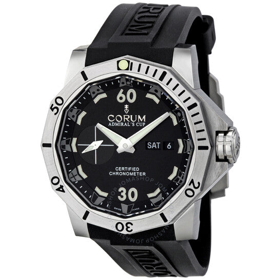 Titanium case with a black rubber strap. Fixed titanium bezel. Black dial with silver-tone hands and index hour markers. Arabic numeral minute markers at the 30 and 60 minute positions. Minute markers around the outer rim. Dial Type: Analog. Luminescent hands and markers. Day of the week and date display at the 3 o'clock position. Small second sub-dial at the 9 o'clock position. Automatic movement with a 48 hour power reserve. Scratch resistant sapphire crystal. Protected screw down crown. Solid case back. Case diameter: 46 mm. Case thickness: 14 mm. Band width: 22 mm. Tang clasp. Water resistant at 300 meters / 1000 feet. Functions: date, hour, minute, second. Casual watch style. Watch label: Swiss Made. Corum Admirals Cup Seafender 46 Chrono Automatic Watch 947.401.04/0371 AN12.