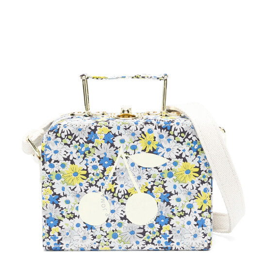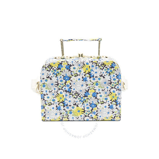 Bonpoint Ladies Crossbody. SKU: S04GBAW00003-515. Barcode: 3605795191499. Color: Blue. Bonpoint Aimane Suitcase Bag. The Aimane Suitcase bag is crafted from organic cotton and features a hard rectangular body with an all-over floral print and logo print on the front. It has a clip-lock fastening, a single top handle, and an adjustable, detachable shoulder strap. The bag includes a main compartment, an internal logo patch, canvas lining, and gold-tone hardware. Organic Cotton 100%