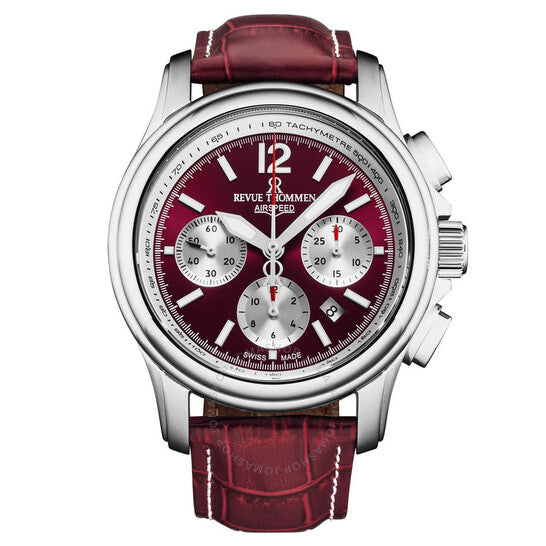Silver-tone stainless steel case with a red leather strap. Fixed silver-tone stainless steel bezel. Red dial with silver-tone hands and index hour markers. Minute markers around the outer rim. Dial Type: Analog. Luminescent hands and markers. Date display between 4 and 5 o'clock position. Automatic movement. Scratch resistant sapphire crystal. Screw down crown. Transparent case back. Round case shape, case size: 44 mm, case thickness: 16 mm. Band width: 22 mm. Tang clasp. Water resistant at 100 meters / 330 feet. Functions: chronograph, date, hour, minute, second. Air Speed Series. Luxury watch style. Watch label: Swiss Made. Revue Thommen Air Speed Chronograph Automatic Red Dial Men's Watch 16041.6336.