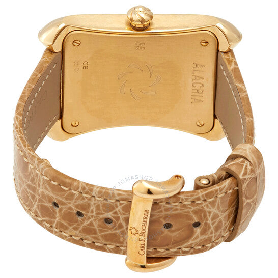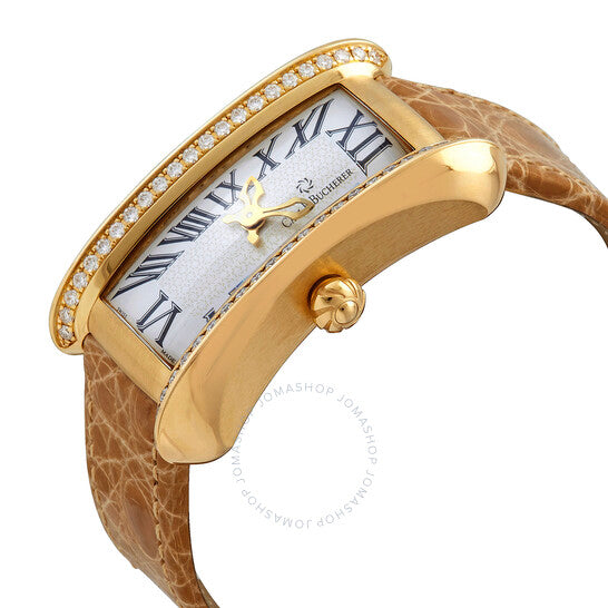 18 carat yellow gold case with a water snake and lizard leather strap. Fixed- diamond set bezel. Silver dial with gold-tone hands and Roman numeral hour markers. Dial Type: Analog. Carl F. Bucherer Calibre CFB 1852 quartz movement. Scratch resistant sapphire crystal. Pull / push crown. Case size: 31.3 mm x 45 mm. Unique case shape. Water resistant at 30 meters / 100 feet. Functions: hour, minute. Additional Info: case set with 46 diamonds (1.1 ct). Luxury watch style. Watch label: Swiss Made. Item Variations: 369.383.0. Carl F. Bucherer Alacria Diva Ladies Watch 00.10705.01.21.11.
