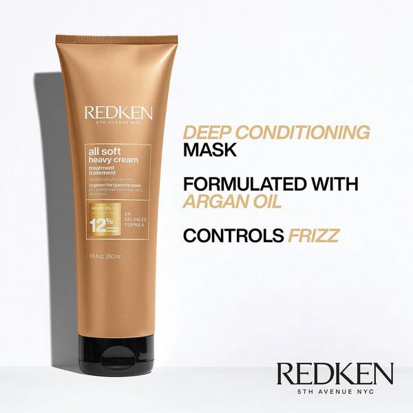 Redken's All Soft Heavy Cream Hair Mask is a deep conditioning, anti-frizz hair treatment for dry and brittle hair. This moisturizing conditioner restores strength and softness and is made with argan oil to achieve shiny, smooth hair.