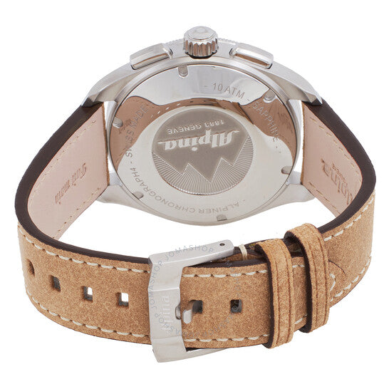 Silver-tone stainless steel case with a brown leather strap. Bi-directional rotating silver-tone stainless steel bezel. Blue dial with silver-tone hands and Arabic numeral & index hour markers. Minute markers around the outer rim. Dial Type: Analog. Luminescent hands and markers. Chronograph - two sub-dials displaying: 60 second and 30 minute. Alpina Calibre AL-860 Automatic movement, containing 26 Jewels, bitting at 28800 vph, and has a power reserve of approximately 38 hours. Scratch resistant sapphire crystal. Solid case back. Round case shape, case size: 44 mm, case thickness: 15.7 mm. Band width: 22 mm, band length: 8 inches. Tang clasp. Water resistant at 100 meters / 330 feet. Functions: chronograph, hour, minute, second. Additional Info: hours, minutes, seconds, chronograph. Alpiner Series. Luxury watch style. Watch label: Swiss Made. Alpina Alpiner Chronograph Automatic Blue Dial Men's Watch AL-860LNS5AQ6-BF.