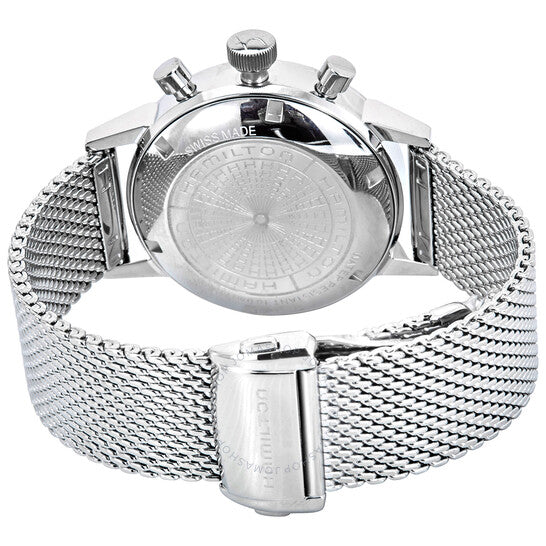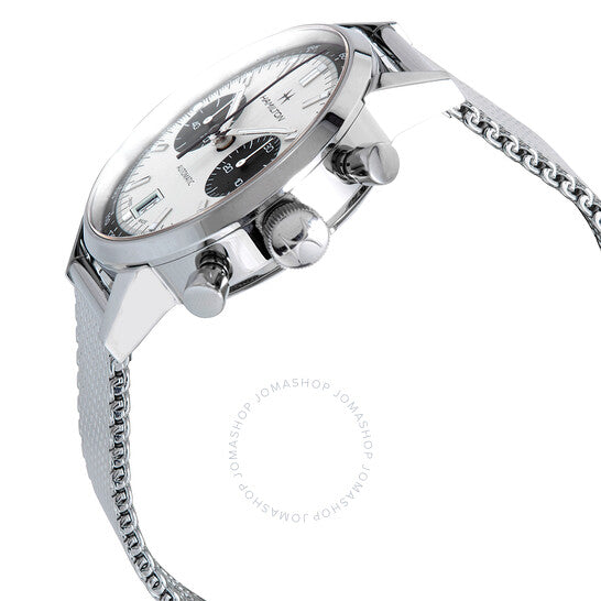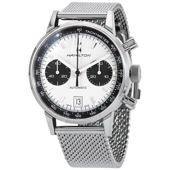 Stainless steel case with a stainless steel mesh bracelet. Fixed stainless steel bezel. White dial with luminous silver-tone hands and index hour markers. Minute markers. Tachymeter markings around the outer rim. Dial Type: Analog. Luminescent hands and markers. Date display at the 6 o'clock position. Chronograph - two black sub-dials displaying: 30 minute and 60 second. Hamilton calibre H-31 automatic movement, based upon ETA 7753, containing 27 Jewels, bitting at 28800 vph, and has a power reserve of approximately 60 hours. Scratch resistant sapphire crystal. Screw down crown. Solid case back. Round case shape. Case size: 40 mm. Band width: 20 mm. Fold over slip through clasp. Water resistant at 100 meters / 330 feet. Functions: chronograph, tachymeter, date, hour, minute, second. American Classic Series. Sport watch style. Watch label: Swiss Made. Hamilton American Classic Chronograph Automatic White Dial Men's Watch H38416111.