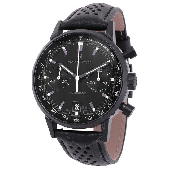 Black stainless steel case with a black leather strap. Fixed black stainless steel bezel. Black dial with black hands and index hour markers. Minute markers around the outer rim. Dial Type: Analog. Luminescent hands and markers. Date display at the 6 o'clock position. Chronograph - two sub-dials displaying: 30 minute and 60 second. Hamilton Calibre H-31 Automatic movement, based upon ETA 7753, containing 27 Jewels, bitting at 28800 vph, and has a power reserve of approximately 60 hours. Scratch resistant sapphire crystal. Screw down crown. Solid case back. Round case shape, case size: 40 mm, case thickness: 14.45 mm. Band width: 20 mm. Buckle clasp. Water resistant at 100 meters / 330 feet. Functions: chronograph, date, hour, minute, second. American Classic Series. Watch label: Swiss Made. Hamilton American Classic Intra-Matic Chronograph Automatic Black Dial Watch H38446730.