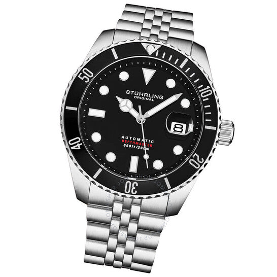 Men's Automatic Dive Watch Silver Stainless Steel Case, Black Dial, Stainless Jubilee bracelet Silver-tone alloy case with a silver-tone stainless steel bracelet. Black alloy bezel. Black dial with silver-tone hands and index hour markers. Minute markers around the outer rim. Dial Type: Analog. Luminescent hands and markers. Date display at the 3 o'clock position. Automatic movement. Round case shape, case size: 50 mm. Band width: 22 mm. Fold over clasp with a safety release. Water resistant at 200 meters / 660 feet. Functions: date, hour, minute, second. Additional Info: luminous hands, luminous markers, day of month. Aquadiver Series. Dress watch style. Stuhrling Original Aquadiver Automatic Black Dial Men's Watch M18016.