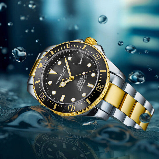 Men's Jap Automatic Diver Watch, Black Dial Black Bezel, Two Tone Yellow Gold Stainless Steel Bracelet Silver-tone alloy case with a two-tone (silver-tone and yellow gold-tone) stainless steel bracelet. Black alloy bezel. Black dial with yellow gold-tone hands and index hour markers. Minute markers around the outer rim. Dial Type: Analog. Luminescent hands and markers. Date display at the 3 o'clock position. Automatic movement. Round case shape, case size: 42 mm. Deployment with push button release clasp. Water resistant at 100 meters / 330 feet. Functions: date, hour, minute, second. Aquadiver Series. Dive watch style. Stuhrling Original Aquadiver Automatic Black Dial Men's Watch M18255.