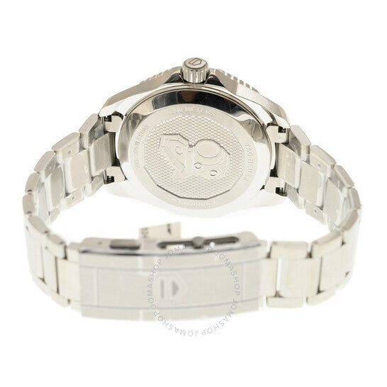 Silver-tone stainless steel case and bracelet. Turning bezel blue and white 24 hour scale ceramic bezel. Blue dial with silver-tone hands and index hour markers. Minute markers around the outer rim. Dial Type: Analog. Luminescent hands and markers. Date display at the 6 o'clock position. Tag Heuer Calibre 7 Automatic movement, based upon ETA 2892-A2, containing 25 Jewels, bitting at 28800 vph, and has a power reserve of approximately 46 hours. Scratch resistant sapphire crystal. Solid case back. Dodecagon case shape, case size: 43 mm. Deployment with push button release clasp. Water resistant at 300 meters / 1000 feet. Functions: date, GMT, second time zone, hour, minute, second. Aquaracer Series. Luxury watch style. Watch label: Swiss Made. Tag Heuer Aquaracer Automatic Blue Dial Men's Watch WBP2010.BA0632.