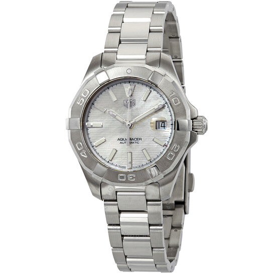 Stainless steel case with a stainless steel bracelet. Uni-directional rotating stainless steel bezel with a silver-tone (count-up elapsed time) top ring. Mother of pearl dial with silver-tone hands and index hour markers. Minute markers on bezel. Dial Type: Analog. Luminescent hands. Date display at the 3 o'clock position. Tag Heuer calibre 9 automatic movement, based upon Sellita SW1000-1, containing 18 Jewels, bitting at 28800 vph, and has a power reserve of approximately 40 hours. Scratch resistant sapphire crystal. Screw down crown. Solid case back. Dodecagon case shape. Case size: 32 mm. Fold over clasp with a double safety push button release. Water resistant at 300 meters / 1000 feet. Functions: date, hour, minute, second. Aquaracer Series. Dive watch style. Watch label: Swiss Made. Tag Heuer Aquaracer Automatic Mother of Pearl Dial Ladies Watch WBD2311.BA0740.