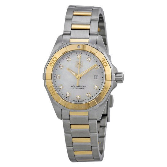 Stainless steel case with a stainless steel bracelet with 18kt yellow gold links. Uni-directional rotating 18kt gold bezel with markers. Mother of pearl dial with luminous gold-toned hands and diamond hour markers. Minute markers around the outer rim. Dial Type: Analog. Luminescent hands. Date display at the 3 o'clock position. Quartz movement. Scratch resistant sapphire crystal. Screw down crown. Screw in case back. Case diameter: 27 mm. Case thickness: 9.5 mm. Dodecagon case shape. Band width: 16 mm. Deployment clasp. Water resistant at 300 meters / 1000 feet. Functions: date, hour, minute, second. Luxury watch style. Watch label: Swiss Made. Tag Heuer Aquaracer Mother of Pearl Diamond Dial Ladies Watch WAY1451.BD0922.