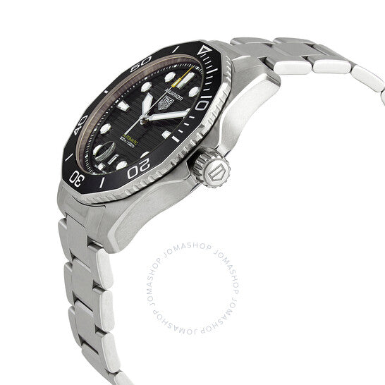 Stainless steel case with a stainless steel bracelet. Uni-directional rotating stainless steel bezel with an inlaid black ceramic ring. Black dial with luminous silver-tone hands and dot hour markers. Minute markers around the outer rim. Dial Type: Analog. Luminescent hands and markers. Date display at the 6 o'clock position. TAG Heuer calibre 5 automatic movement, based upon ETA 2824-2, containing 26 Jewels, bitting at 28800 vph, and has a power reserve of approximately 38 hours. Scratch resistant sapphire crystal. Screw down crown. Solid case back. Dodecagon case shape. Case size: 43 mm. Band width: 22 mm. Fold over clasp with a safety release. Water resistant at 300 meters / 1000 feet. Functions: date, hour, minute, second. Aquaracer Series. Dive watch style. Watch label: Swiss Made. Tag Heuer Aquaracer Professional 300 Automatic Black Dial Men's Watch WBP201A.BA0632.