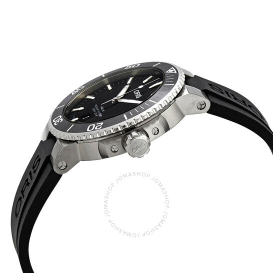 Stainless steel case with a black rubber strap. Uni-directional rotating stainless steel bezel with a black ceramic ring. Black dial with luminous silver-tone hands and index hour markers. Minute markers around the outer rim. Dial Type: Analog. Luminescent hands and markers. Date display at the 6 o'clock position. Oris calibre 733, base SW 200-1 automatic movement with a 38-hour power reserve. Scratch resistant sapphire crystal. Screw down crown. Transparent case back. Round case shape. Case size: 43.5 mm. Case thickness: 12.60 mm. Band width: 24 mm. Deployment clasp. Water resistant at 300 meters / 1000 feet. Functions: date, hour, minute, second. Luxury watch style. Watch label: Swiss Made. Oris Aquis Automatic Black Dial Men's Watch 01 733 7730 4124-07 4 24 64EB.