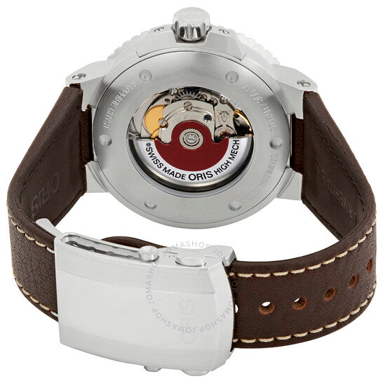 Stainless steel case with a brown leather strap. Uni-directional rotating coin edge stainless steel bezel with a black ceramic ring. Blue dial with luminous silver-tone hands and index hour markers. Minute markers around the outer rim. Dial Type: Analog. Luminescent hands and markers. Date display at the 6 o'clock position. Oris calibre 733 automatic movement, based upon Sellita SW200-1, containing 26 Jewels, bitting at 28800 vph, and has a power reserve of approximately 38 hours. Scratch resistant sapphire crystal. Screw down crown. Transparent case back. Round case shape. Case size: 43.5 mm. Case thickness: 12.6 mm. Band width: 24 mm. Deployment clasp. Water resistant at 300 meters / 1000 feet. Functions: date, hour, minute, second. Aquis Series. Dive watch style. Watch label: Swiss Made. Oris Aquis Automatic Blue Dial Men's Watch 01 733 7730 4135-07 5 24 10EB.