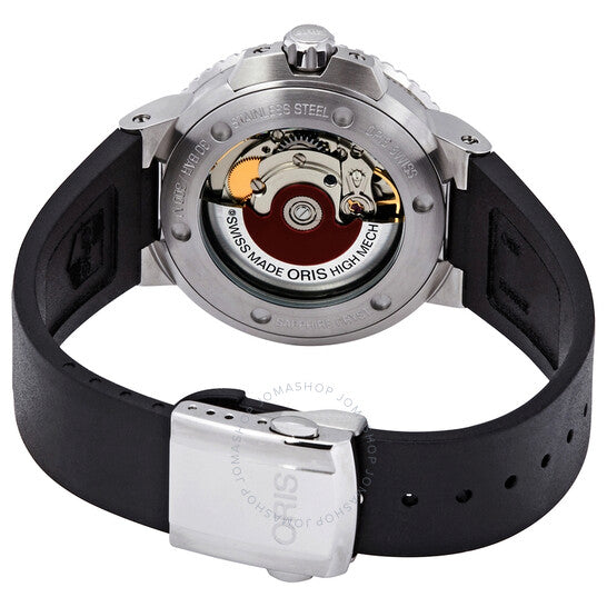Stainless steel case with a black rubber strap. Uni-directional rotating coin edge stainless steel bezel with a black ceramic ring. Blue dial with luminous silver-tone alpha-style shape hands and index hour markers. Minute markers around the outer rim. Dial Type: Analog. Luminescent hands and markers. Date display at the 6 o'clock position. Oris calibre 733 automatic movement, based upon Sellita SW200-1, containing 26 Jewels, bitting at 28800 vph, and has a power reserve of approximately 38 hours. Scratch resistant sapphire crystal. Screw down crown. Transparent case back. Round case shape. Case size: 39.5 mm. Band width: 21 mm. Fold over clasp. Water resistant at 300 meters / 1000 feet. Functions: date, hour, minute, second. Aquis Series. Luxury watch style. Watch label: Swiss Made. Oris Aquis Automatic Blue Dial Men's Watch 01 733 7732 4135-07 4 21 64FC.