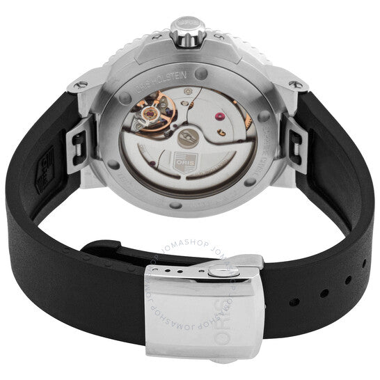 Stainless steel case with a black rubber strap. Uni-directional rotating stainless steel bezel with an inlaid green ring. Green dial with luminous silver-tone hands and index hour markers. Minute markers around the outer rim. Dial Type: Analog. Luminescent hands and markers. Date display at the 6 o'clock position. Oris calibre 400 automatic movement, containing 21 Jewels, bitting at 28800 vph, and has a power reserve of approximately 120 hours. Scratch resistant sapphire crystal. Screw down crown. Transparent case back. Round case shape, Case size: 41.5 mm. Band width: 22 mm. Fold over clasp. Water resistant at 300 meters / 1000 feet. Functions: date, hour, minute, second. Aquis Series. Dive watch style. Watch label: Swiss Made. Oris Aquis Automatic Green Dial Men's Watch 01 400 7769 4157-07 4 22 74FC.
