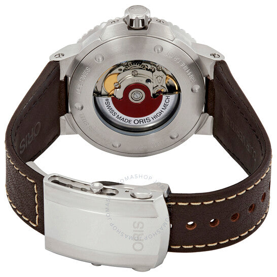 Stainless steel case with a brown leather strap. Uni-directional rotating coin edge stainless steel bezel with a green ceramic ring. Green dial with luminous silver-tone hands and index hour markers. Minute markers around the outer rim. Dial Type: Analog. Luminescent hands and markers. Date display at the 6 o'clock position. Oris calibre 733 automatic movement, based upon Sellita SW200-1, containing 26 Jewels, bitting at 28800 vph, and has a power reserve of approximately 38 hours. Scratch resistant sapphire crystal. Screw down crown. Transparent case back. Round case shape. Case size: 43.5 mm. Case thickness: 12.6 mm. Band width: 24 mm. Fold over clasp. Water resistant at 300 meters / 1000 feet. Functions: date, hour, minute, second. Aquis Series. Dive watch style. Watch label: Swiss Made. Oris Aquis Automatic Green Dial Men's Watch 01 733 7730 4157-07 5 24 10EB.