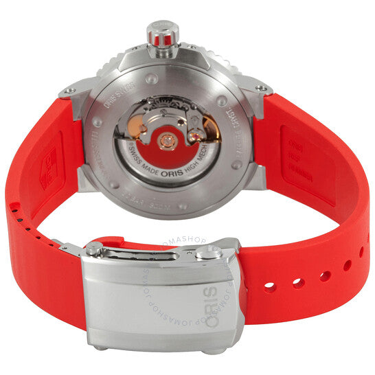 Stainless steel case with a red rubber strap. Uni-directional rotating stainless steel bezel. Grey dial with silver-tone hands and index hour markers. Minute markers around the outer rim. Dial Type: Analog. Luminescent hands and markers. Date display at the 6 o'clock position. Oris calibre 733 automatic movement, based upon Sellita SW200-1, containing 26 Jewels, bitting at 28800 vph, and has a power reserve of approximately 38 hours. Anti-reflective scratch resistant sapphire crystal. Screw down crown. Transparent case back. Round case shape. Ccase size: 43.5 mm. Case thickness: 12.60 mm. Push button deployant clasp. Water resistant at 300 meters / 1000 feet. Functions: date, hour, minute, second. Aquis Series. Dive watch style. Watch label: Swiss Made. Oris Aquis Automatic Grey Dial Men's Watch 01 733 7730 4153-07 4 24 66EB.