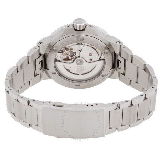 Silver-tone stainless steel case and bracelet. Uni-directional rotating green steel and ceramic bezel. Green dial with silver-tone hands and index hour markers. Minute markers around the outer rim. Dial Type: Analog. Luminescent hands and markers. Date display at the 6 o'clock position. Oris Calibre 400 Automatic movement, containing 21 Jewels, bitting at 28800 vph, and has a power reserve of approximately 120 hours. Scratch resistant sapphire crystal. Screw down crown. Round case shape, case size: 43.5 mm. Fold over clasp with a safety release. Water resistant at 30 meters / 100 feet. Functions: date, hour, minute, second. Aquis Date Series. Casual watch style. Watch label: Swiss Made. Item Variations: 01 400 7763 4157-07 8 24 09PEB. Oris Aquis Date Automatic Green Dial Men's Watch 40077634157-0782409PEB.