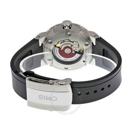 Stainless steel case with a black rubber strap. Unidirectional stainless steel bezel witha grey ceramic top ring. Grey dial with luminous hands and index hour markers. Minute markers around the outer rim. Dial Type: Analog. Luminescent hands and markers. Date display at the 6 o'clock position. Automatic movement with a 38-hour power reserve. Scratch resistant sapphire crystal. Screw down crown. Skeleton case back. Case diameter: 43 mm. Round case shape. Deployment clasp. Water resistant at 300 meters / 1000 feet. Functions: date, hour, minute, second. Luxury watch style. Watch label: Swiss Made. Oris Aquis Date Automatic Grey Dial Men's Watch 733-7653-4153RS
