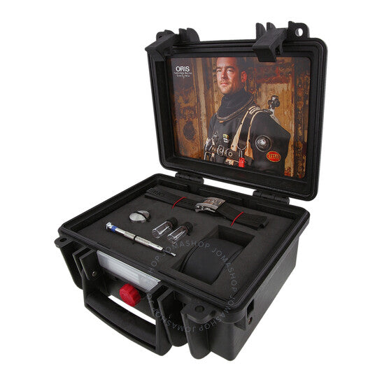 Titanium case with a titanium bracelet. Black titanium bezel with a black ceramic top ring. Black dial with red and silver-tone hands and index hour markers. Minute markers around the outer rim. Dial Type: Analog. Luminescent hands and markers. Date display at the 6 o'clock position. Two sub-dials displaying: 60 second and 12 hour. Oris 749, base SW 220 automatic movement with a 38-hour power reserve. Scratch resistant sapphire crystal. Screw down crown. Transparent case back. Case size: 43 mm. Case thickness: 14 mm. Round case shape. Band width: 26 mm. Fold over clasp. Water resistant at 300 meters / 1000 feet. Functions: date, hour, small minute, small second. Luxury watch style. Watch label: Swiss Made. Item Variations: 749 7677 7154MB, 749.7677.7154MB, 74976777154MB. Oris Aquis Regulateur Der Meistertaucher Black Dial Men's Watch 749-7677-7154MB.