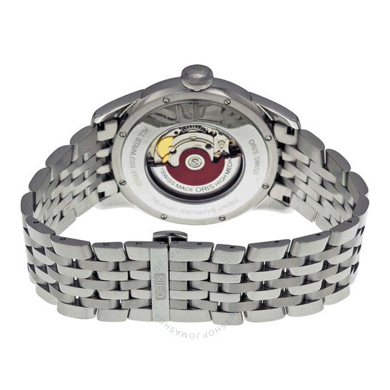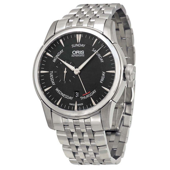 Stainless steel case with a stainless steel bracelet. Fixed stainless steel bezel. Black dial with luminous silver-tone hands and index hour markers. Days of the week around an inner ring. Minute markers around the outer rim. Dial Type: Analog. Luminescent hands and markers. Date display at the 6 o'clock position. Seconds sub-dial at the 9 o'clock position subdials. Oris calibre 745, base SW 220-1 automatic movement with a 38-hour power reserve. Scratch resistant sapphire crystal. Pull / push crown. Transparent case back. Case size: 44 mm. Case thickness: 12 mm. Round case shape. Band width: 23 mm. Deployment clasp. Water resistant at 50 meters / 165 feet. Functions: date, day, hour, minute, second. Casual watch style. Watch label: Swiss Made. Oris Artelier Automatic Black Dial Men's Watch 745-7666-4054MB.