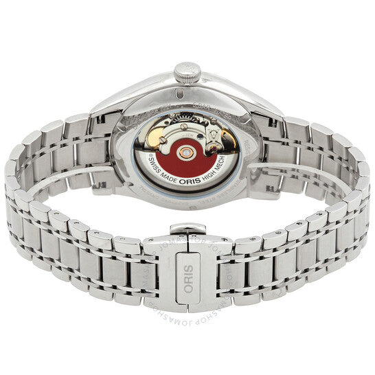 Silver-tone stainless steel case with a silver-tone stainless steel bracelet. Fixed silver-tone stainless steel bezel. Blue dial with silver-tone hands and index hour markers. Minute scale around the inner rim. Dial Type: Analog. Luminescent hands. Date display at the 6 o'clock position. Oris Calibre 733, based upon SW 200-1, containing 26 Jewels, bitting at 28800 vph, and has a power reserve of approximately 38 hours. Scratch resistant sapphire crystal. Pull / push crown. Round case shape. Case size: 40 mm. Folding clasp. Water resistant at 50 meters / 165 feet. Functions: date, hour, minute, second. Casual watch style. Watch label: Swiss Made. Oris Artelier Automatic Blue Dial Men's Watch 01 733 7721 4055-07 8 21 88.