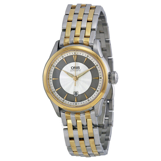 Stainless steel case with a two-tone (silver and yellow gold PVD) stainless steel bracelet. Fixed gold PVD bezel. Silver dial with gold-tone hands and index hour markers. Minute markers around the outer rim. Dial Type: Analog. Luminescent hands and markers. Date display at the 6 o'clock position. Automatic movement with a 38-hour power reserve. Scratch resistant sapphire crystal. Skeleton case back. Case diameter: 31 mm. Round case shape. Deployment clasp with a push button release. Water resistant at 30 meters / 100 feet. Functions: date, hour, minute, second. Casual watch style. Watch label: Swiss Made. Oris Artelier Automatic Silver Dial Two-tone Ladies Watch 561-7604-4351MB.