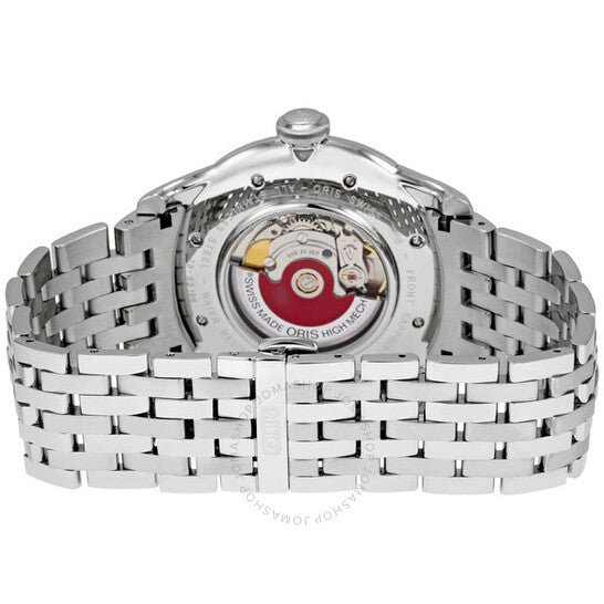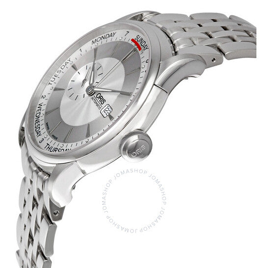 Silver-tone stainless steel case with a silver-tone stainless steel bracelet. Fixed silver-tone stainless steel bezel. Silver guilloche dial with luminous silver tone hands and index hour markers. Minute markers. days of the week displayed around the outer rim. Dial Type: Analog. Luminescent hands and markers. Date display at the 3 o'clock position. One subdial displaying: small second. Oris Calibre 645 Automatic movement, based upon ETA 2836-2, containing 27 Jewels, bitting at 28800 vph, and has a power reserve of approximately 38 hours. Scratch resistant anti-reflective sapphire crystal. Pull / push crown. Skeleton case back. Round case shape, case size: 45 mm, case thickness: 10 mm. Band width: 23 mm. Fold over with push button release clasp. Water resistant at 30 meters / 100 feet. Functions: date, day, hour, minute, second. Additional Info: withstands rain and splashes of water, but not showering or submersion. Artelier Small, Second Pointer Date Series. Dress watch style. Watch label: Swiss Made. Item Variations: Oris 645 7596 4051 MB, 64575964051MB, 645.7596.4051.MB. Oris Artelier Automatic Silver Dial Men's Watch 01 645 7596 4051 07 8 24 73.