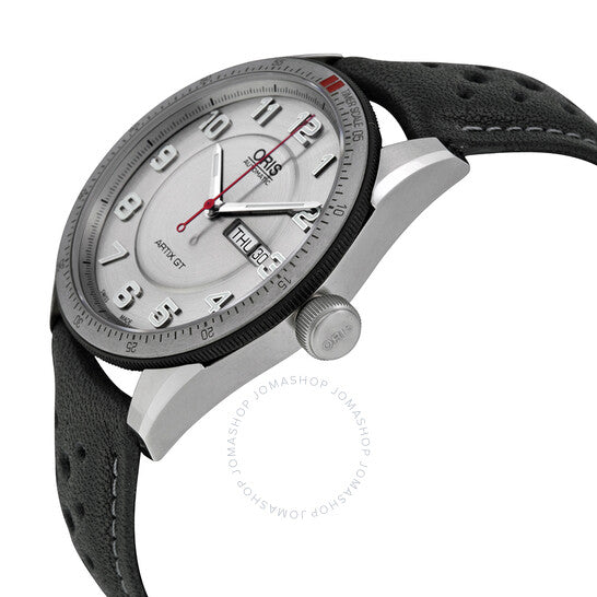 Stainless steel case with a black leather strap. Bi-directional rotating stainless steel bezel. Silver dial with luminous silver-tone hands and Arabic numeral hour markers. Minute markers around the outer rim. Dial Type: Analog. Luminescent hands and markers. Day of the week and date display at the 3 o'clock position. Oris calibre 735, base SW 220-1 automatic movement with a 38-hour power reserve. Scratch resistant sapphire crystal. Screw down crown. Transparent case back. Round case shape. Case size: 42 mm. Case thickness: 11.60 mm. Band width: 21 mm. Band length: 8.5 inches. Fold over clasp. Water resistant at 100 meters / 330 feet. Functions: date, day, hour, minute, second. Luxury watch style. Watch label: Swiss Made. Oris Artix Automatic Silver Dial Men's Watch 01 735 7662 4461-07 5 18 87FC.