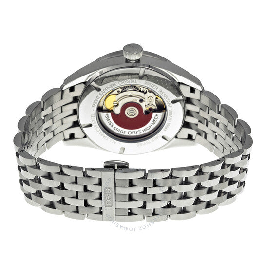 Stainless steel case with a stainless steel bracelet. Fixed stainless steel bezel. Black dial with luminous silver-tone hands and index / small Arabic numeral hour markers. Minute markers around the outer rim. Dial Type: Analog. Luminescent hands and markers. Date display at the 6 o'clock position. Automatic movement with a 38-hour power reserve. Scratch resistant sapphire crystal. Pull / push crown. Skeleton case back. Case size: 42 mm. Case thickness: 12 mm. Round case shape. Band width: 21 mm. Deployment with push button release clasp. Water resistant at 100 meters / 330 feet. Functions: date, hour, minute, second. Luxury watch style. Watch label: Swiss Made. Oris Artix Date Automatic Black Dial Men's Watch 73376424034MB.