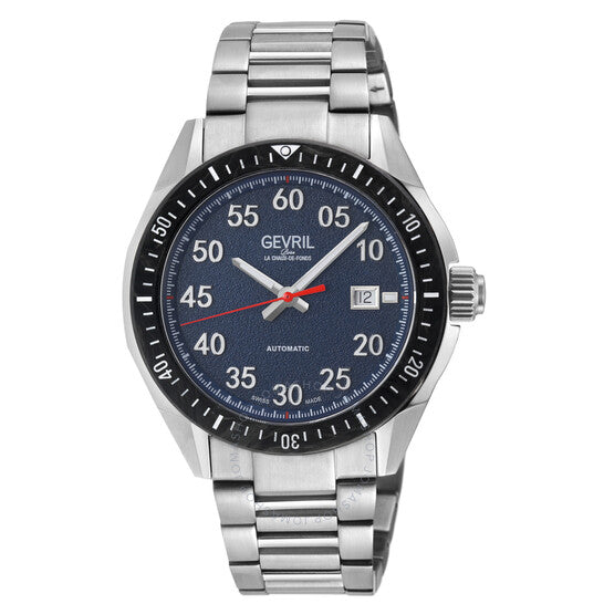 Silver-tone stainless steel case and bracelet. Fixed black stainless steel bezel. Blue dial with silver-tone hands and Arabic numeral hour markers. Minute markers around the outer rim. Dial Type: Analog. Luminescent hands and markers. Date display at the 3 o'clock position. Sellita Caliber SW220 automatic movement. Scratch resistant sapphire crystal. Screw down crown. Transparent see through case back. Round case shape, case size: 43 mm, case thickness: 12 mm. Band width: 18 mm. Deployment with push button release clasp. Water resistant at 100 meters / 330 feet. Functions: date, hour, minute, second. Additional Info: forged carbon bezel. Ascari Series. Luxury watch style. Watch label: Swiss Made. Gevril Ascari Automatic Blue Dial Men's Watch 48301B.