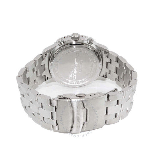 Silver-tone stainless steel case and bracelet. Fixed silver-tone stainless steel bezel. Blue dial with silver-tone hands and Arabic numeral hour markers. Minute markers around the outer rim. Dial Type: Analog. Luminescent hands. Date display between 4 and 5 o'clock position. Chronograph - sub-dials displaying: 24 hour. Epson VR32 quartz movement. Scratch resistant mineral crystal. Pull / push crown. Solid case back. Round case shape, case size: 46 mm, case thickness: 12.75 mm. Band width: 24 mm, band length: 7.25 inches. Fold over with double push button release clasp. Water resistant at 100 meters / 330 feet. Functions: chronograph, date, hour, minute, second. Additional Info: mother of pearl dial. Aureum-mb Series. Casual watch style. Watch label: Chronograph, Japan Mov't. Torino Carrero Aureum-Mb Chronograph Quartz Blue Dial Men's Watch C1S7022-BU.