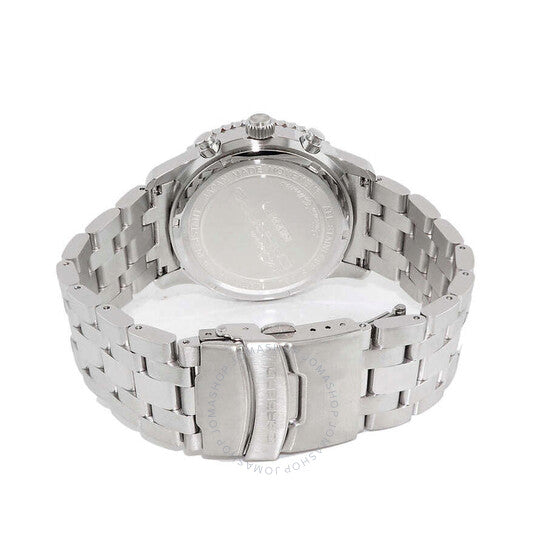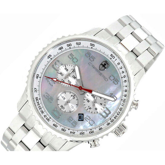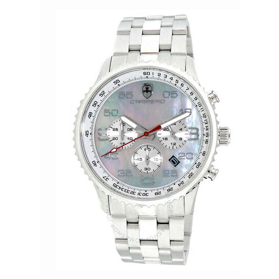 Silver-tone stainless steel case and bracelet. Fixed silver-tone stainless steel bezel. Brown dial with silver-tone hands and Arabic numeral & index hour markers. Minute markers around the outer rim. Dial Type: Analog. Luminescent hands. Date display between 4 and 5 o'clock position. Chronograph - sub-dials displaying: 24 hour. Epson VR32 quartz movement. Scratch resistant mineral crystal. Pull / push crown. Solid case back. Round case shape, case size: 46 mm, case thickness: 12.75 mm. Band width: 24 mm, band length: 7.25 inches. Fold over with double push button release clasp. Water resistant at 100 meters / 330 feet. Functions: chronograph, date, hour, minute, second. Additional Info: mother of pearl dial. Aureum-mb Series. Casual watch style. Watch label: Chronograph, Japan Mov't. Torino Carrero Aureum-Mb Chronograph Tachymeter Brown Dial Men's Watch C1S7022-BN.