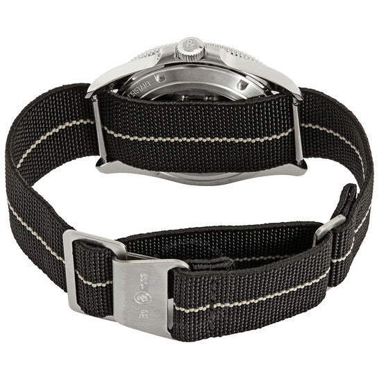 Stainless steel case with a black (elastic) canvas strap. Uni-directional rotating stainless steel bezel with a black aluminium ring. Beige dial with luminous black hands and Arabic numeral hour markers. Minute markers around the outer rim. Dial Type: Analog. Date display between the 4 and 5 o'clock positions. Bell and Ross calibre BR-CAL.302 automatic movement, based upon Sellita SW300-1, containing 25 Jewels, bitting at 28800 vph, and has a power reserve of approximately 38 hours. Scratch resistant sapphire crystal. Screw down crown. Transparent case back. Round case shape. Case size: 41 mm. Band width: 20 mm. Slip through clasp. Water resistant at 100 meters / 330 feet. Functions: date, hour, minute, second. Luxury watch style. Watch label: Swiss Made. Bell and Ross Automatic Beige Dial Men's Watch BRV292-BEI-ST/SF.