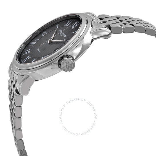 Stainless steel case with a stainless steel bracelet. Fixed stainless steel bezel. Grey dial with silver-tone Breguet-style hands and Roman numeral hour markers. Minute markers around the outer rim. Dial Type: Analog. Date display at the 3 o'clock position. Caliber RW 4200 automatic movement with a 38-hour power reserve. Scratch resistant sapphire crystal. Pull / push crown. Transparent case back. Round case shape. Case size: 39.5 mm. Case thickness: 9.2 mm. Band width: 19 mm. Tang clasp. Water resistant at 50 meters / 165 feet. Functions: date, hour, minute, second. Casual watch style. Watch label: Swiss Made. Raymond Weil Automatic Grey Dial Stainless Steel Men's Watch 2837-ST-00609.