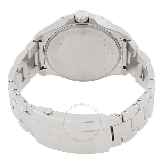 Silver-tone stainless steel case and bracelet. Bi-directional rotating silver-tone stainless steel bezel. Black dial with silver-tone hands and index hour markers. Minute markers around the outer rim. Dial Type: Analog. Luminescent hands and markers. Date display at the 3 o'clock position. Breitling Calibre 32 Automatic movement, based upon ETA 2893-2, containing 21 Jewels, bitting at 28800 vph, and has a power reserve of approximately 42 hours. Scratch resistant sapphire crystal. Screw down crown. Solid case back. Round case shape, case size: 44 mm, case thickness: 12 mm. Folding clasp. Water resistant at 300 meters / 1000 feet. Functions: GMT, second time zone, hour, minute, second. Avenger Series. Sport watch style. Watch label: Swiss Made. Breitling Avenger Automatic Black Dial Men's Watch A32320101B1A1.