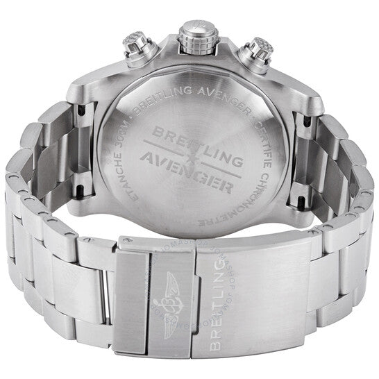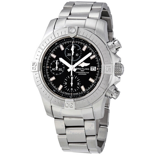 Stainless steel case with a stainless steel bracelet. Uni-directional rotating stainless steel bezel. Black dial with luminous silver-tone hands and index hour markers. Minute markers. 1/100th second markers around the outer rim. Dial Type: Analog. Luminescent hands and markers. Date display at the 3 o'clock position. Chronograph - three sub-dials displaying: 60 second, 30 minute and 12 hour. Breitling calibre 13 automatic movement, based upon ETA Valjoux 7750, containing 25 Jewels, bitting at 28800 vph, and has a power reserve of approximately 42 hours. Scratch resistant sapphire crystal. Screw locked crown. Solid case back. Round case shape. Case size: 43 mm. Case thickness: 16.43 mm. Band width: 22 mm / 20 mm. Fold over clasp with a safety release. Water resistant at 300 meters / 1000 feet. Functions: chronograph, date, hour, minute, second, chronometer. Dive watch style. Watch label: Swiss Made. Breitling Avenger Chronograph Automatic Black Dial Men's Watch A13385101B1A1.