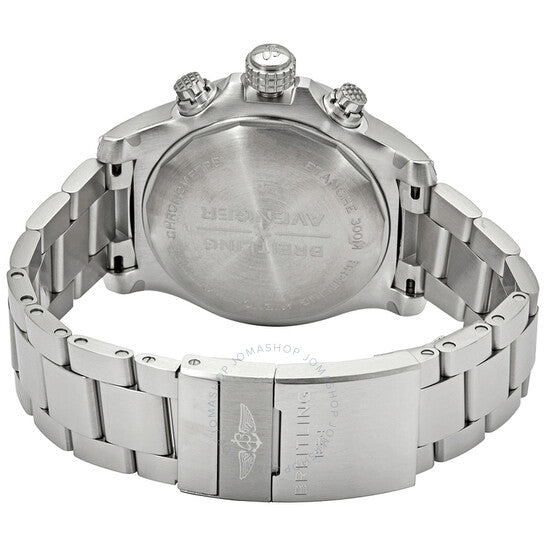 Silver-tone stainless steel case and bracelet. Uni-directional rotating silver-tone stainless steel bezel. Blue dial with luminous silver-tone hands and index hour markers. Minute markers. 1/100th second markers around the outer rim. Dial Type: Analog. Luminescent hands and markers. Date display at the 3 o'clock position. Chronograph - three sub-dials displaying: 60 second, 30 minute and 12 hour. Breitling Calibre 13 Automatic movement, based upon ETA Valjoux 7750, containing 25 Jewels, bitting at 28800 vph, and has a power reserve of approximately 42 hours. Scratch resistant sapphire crystal. Screw locked crown. Solid case back. Round case shape, case size: 45 mm, case thickness: 16.46 mm. Band width: 22 mm. Fold over clasp with a safety release. Water resistant at 300 meters / 1000 feet. Functions: chronograph, date, hour, minute, second, chronometer. Avenger Chronograph Series. Dive watch style. Watch label: Swiss Made. Breitling Avenger Chronograph Automatic Blue Dial Men's Watch A13317101C1A1.