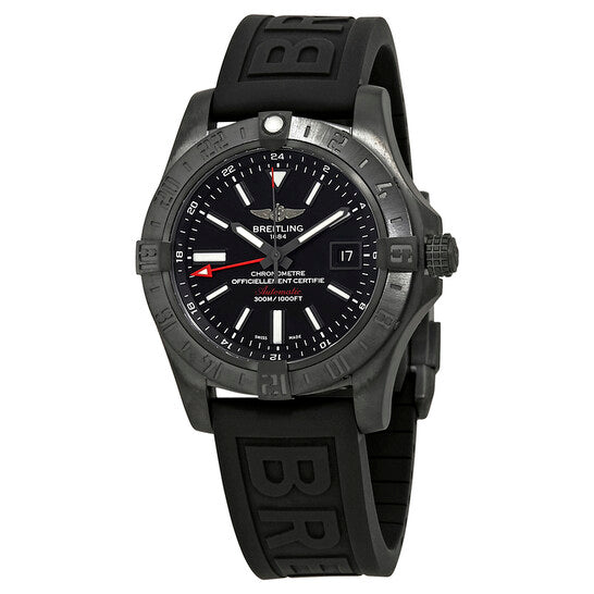 Black stainless steel case with a black rubber diver pro iii strap. Bi-directional rotating bezel. Black dial with index hour markers. 24-hour second time-zone. Dial Type: Analog. Date display at the 3 o'clock position. Breitling 32 automatic movement with a 42-hour power reserve. Scratch resistant sapphire crystal. Screw down crown. Round case shape, case size: 43 mm, case thickness: 12.20 mm. Band width: 22/20 mm. Water resistant at 300 meters / 1000 feet. Functions: date, hour, minute, second. Luxury watch style. Watch label: Swiss Made. Breitling Avenger II GMT Black Dial Automatic Men's Watch M3239010/BF04/153S/M20DSA.2.